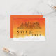 Esta moderna tarjeta Save the Date incluye un dibujo de la línea aérea de San Francisco, incluyendo el puente Golden Gate. El fondo tiene una textura de acuarela en tonos rojos y naranjas que recuerda a la puesta de sol. Esta tarjeta es perfecta para nativos o amantes de San Francisco. Es ideal para celebrar una boda en San Francisco, California.