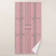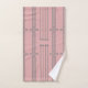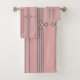 Este conjunto de toallas tiene un diseño art decó de líneas verticales con diamantes y círculos en plata sobre un campo de color rosa.