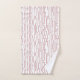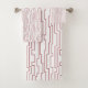 Este juego de toallas tiene un diseño art decó que se asemeja a un circuito. Las líneas se están ejecutando verticalmente en un rosa polvoriento sobre un campo de blanco. ¿Quieres un color diferente? Mándame un mensaje.