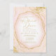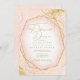 Un fondo de acuarela en tonos de rosa dorado está coronado por un abstracto de líneas doradas finas y efectos de iluminación brillantes para crear las piezas de este hermoso conjunto de boda. La invitación para la cena de ensayo que se muestra aquí también cuenta con un hermoso marco degradado para contener todo su texto. Agregue fácilmente sus propios nombres, fecha de boda y detalles del evento utilizando la plantilla proporcionada. Busque ID867 para ver otras piezas y opciones de colores para este conjunto.