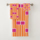 Este conjunto de toallas tiene un diseño moderno de mediados de siglo de líneas verticales naranjas con rectángulos rosas sobre los que se repite a lo largo del diseño.