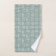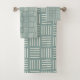 Este conjunto de toallas tiene un diseño moderno de mediados de siglo de cinco líneas blancas, alternativamente horizontales y verticales, repitiendo a lo largo del diseño sobre un fondo retro verde. Si te gusta el diseño pero quieres colores diferentes, envíame un mensaje.