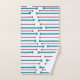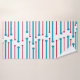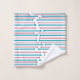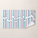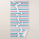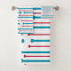 Este conjunto de toallas tiene un diseño moderno de mediados de siglo de líneas rojas y azules con círculos en los extremos sobre un campo de blanco.