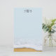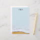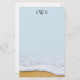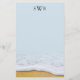 Papel monogramado en blanco con arena de playa e imagen de espuma marina en la parte inferior. El papel de línea tiene un ligero tinte azul o cambia el tipo de papel. Se pueden eliminar tres iniciales negras en la parte superior. Borde de la imagen del océano en la parte inferior. Ninguna imagen al revés.