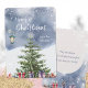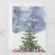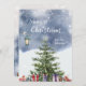 Comparte un saludo invernal pacífico con mi tarjeta de Linterna de árbol de Navidad en acuarela a medianoche. Este hermoso diseño pintado a mano presenta un exuberante árbol de Navidad de pino rodeado de regalos coloridos, colocado contra un dramático fondo de acuarela azul medianoche nevado. Una linterna vintage colgante ilumina la parte superior de la escena, creando una atmósfera acogedora y mágica. El diseño está acentuado con pequeñas bayas rojas y azules en la parte inferior, agregando un toque de color clásico de vacaciones. El reverso continúa con el fondo de lavado azul invernal.
