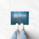 Cuatro lámparas brillantes en cuatro farolas brillan a través de la niebla densa, iluminando un camino sinuoso a través de las sombras y ramas desnudas de árboles invernales.