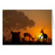 Un solo león femenino espera entre el césped mientras que Thomson gazelles pastan cerca. La puesta de sol brilla detrás de ellos. Arte por computadora de la galardonada artista Kathie Miller.