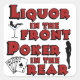 El licor en el póquer delantero en el pegatina trasero con siluetas de pollo caliente y cartas de juego.