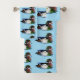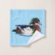 Un pato de madera en el agua con un nenúfar de agua blanca al lado del pato en un fondo abandonado de azul
