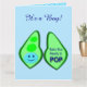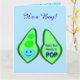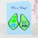 Esta hermosa tarjeta de saludo cuenta con una imagen gráfica de una vaina verde de Pea que contiene 2 guisantes verdes y un gran guisante azul. La gran guisante azul tiene una cara linda con los ojos y la boca. Al otro lado de la vaina de arveja en un texto rosado más oscuro dice "Niño pequeño listo para pop". El diseño es ideal para una invitación de embarazo o una ducha de bebé e incluye texto personalizado para que puedas personalizarlo. Hay un grupo de pequeños guisantes azules en el fondo.