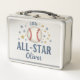 This personalized baseball-themed metal lunch box features a watercolor baseball, red stitching, and a cascade of gold and silver stars with the phrase “Little All-Star.” Perfect for your future MVP!