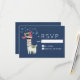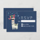 Una tarjeta RSVP para Navidades con un ilustracion gracioso. Una llama linda con gafas de sol negras y un sombrero de santa roja. También con una manta y pompones de estilo sudamericano. La palabra "Alegría" escrita encima de su cabeza con una fuente festiva y colorida. Los copos de nieve azules caen. Se coloca sobre un fondo azul. Diseño temático de Navidades caprichosos y divertidos.