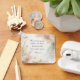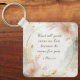 Keychain con escritura cristiana de cita inspiradora representa una acuarela floral elegante con un marco oro simple y flores y vegetación rosa y ruidosa. Presenta un motivador Verso de la Biblia del 1 de Peter 5:7, "Arroja todos tus cuidados sobre él porque te cuida".