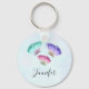 Un llavero con un diseño de bonito. 3 mariposas acuarelas, rosas, violetas y verdes. Un fondo acuático azul claro con toques de rosa claro.