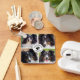Diseño de plantilla de fotografía mascota personalizable para cuatro fotos diferentes. El medio tiene una silueta de papel y dos áreas de texto personalizables. En la parte trasera hay un patrón de impresión de pata blanca sobre un color de fondo negro. Si lo desea, puede cambiar el color de fondo y el color de la huella de la pata a cualquier otro color.