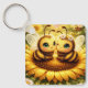 Una linda pareja de abejas besucones acurrucados en un girasol. Parte trasera dice ¡No te preocupes, sé feliz abeja!