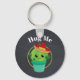 Una cadena de teclas divertida que dice: abrazarme. Con un lindo ilustracion de un cactus verde sentado en una maceta de flores. Grandes ojos kawaii y con sombrero rojo. El fondo es una imagen de pizarra negra.