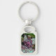 Rama de acebo con bayas moradas en relieve con efecto metálico sobre un fondo abstracto con motivos florales.