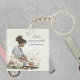 Encantadora cadena de claves del Día de la Madre que presenta un ilustracion a la acuarela de una mujer con el pelo rizado atado, con overoles de flores sobre una camiseta de denim. Se está arrodillando en un jardín, sembrando flores con amor en una olla de terracota con una acuarela de suave color verde. A la derecha del ilustracion, un mensaje sincero está escrito en un guión elegante: "Las madres plantan las semillas del amor que florecen para siempre". El suave fondo verde y los delicados detalles florales realzan el suave y acogedor tono de la carta, convirtiéndola en un hermoso tributo a las madres. Un regalo perfecto para el día de la madre o cuando quieras transmitir gratitud a la madre en tu vida.