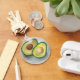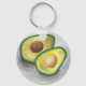 Pintura acuarela de un aguacate verde fresco cortado a la mitad. Fondo moteado gris y azul.