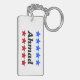 Cadena de teclas de doble cara con el nombre de Ahmad en negro, decorada con estrellas rojas y blancas en la parte superior e inferior del nombre.