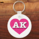 Este llavero cuenta con un corazón vibrante, rosado caliente, que contiene las letras en negrita, blanca y alta funda AK, la abreviatura oficial de Alaska, la última frontera.