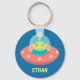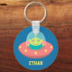 Una colorida cadena de claves con un extraterrestre verde lindo y feliz con antenas en forma de corazón, lo que significa que es un alienígena amigable y viene en paz y se ha salido a hacer amigos. Viaja en una minúscula nave espacial a través de la galaxia. Ideal para los niños que aman los temas espaciales, los cohetes y los OVNIS. Personaliza con el nombre.