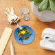 Pintura clave del atardecer de la playa oeste con palmeras, marco redondo de bambú y un loro colorido.
