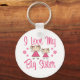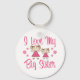 Chicas adorables con figuras de palos, vestidos de rosa con símbolos de flores rosadas. El texto dice "Amo a mi hermana mayor".