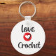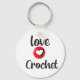 una cadena de claves para una persona que le gusta crochet ayuda a mantener el registro de sus llaves con esta cadena de claves, grandes letras negras y un gran corazón rojo "amor 2 crochet" personaliza la espalda.
