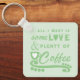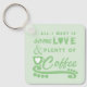 Cadena de llaves de doble lado, idea de regalo de anillo clave para un amante del café. Añadir iniciales en la parte posterior. Amor y mucho café. Oscuro y verde pálido con corazones amorosos.