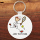 Un keychain de tenis de personalizable con un jugador masculino de tenis con un racquet y una pelota de tenis y un lugar para añadir tu nombre u otro texto.