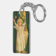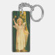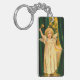 Vintage illustration of a lovely angel with white feather wings and golden hair, ringing the bell for Christmas time. On the background behind the dark green curtains is a nostalgic Christmas tree with bright burning candles.
