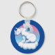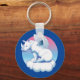 Un rinoceronte blanco con alas de ángel, sentado en la nube en el cielo. Diseño gráfico de la conciencia de la conservación del rinoceronte en la cadena de claves.