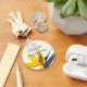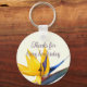 Pájaro del paraíso flor llavero favores de boda con texto personalizado. Una flor tropical amarilla, exótica, aparece en los anillos de llave redonda con escritura morada oscura. La redacción de la muestra es: "Tener y mantener a partir de este día". Dar a los invitados, padres, fiesta nupcial como favores de apreciación.