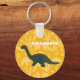 Crea un regalo personalizado que es perfecto para los aficionados a los dinosaurios jóvenes y viejos. Esta cadena de teclas muestra una foto de un dinosaurio apatosauro de juguete plástico en verde con acentos rojos rojos oxidados, ambientado en un fondo amarillo brillante con un patrón de fósiles de huellas de dinosaurios. Agregue su propio nombre u otro texto con letras en negrita y en blanco.
