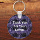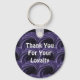 Expresar su aprecio a sus clientes fieles con una cadena de claves con un modelo abstracto moderno. Este pegatina de agradecimiento está adornado con capas de círculos superpuestos con un patrón giratorio morado y negro. "Gracias por tu lealtad" aparece en el centro con una letra blanca y se puede personalizar fácilmente si lo deseas.