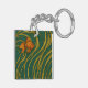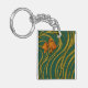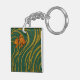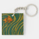 A decorative artwork depicts a stylized orange goldfish swimming through flowing, ribbon-like aquatic forms. The fish, positioned in the upper-left, features intricate, layered scales and delicate fins rendered in warm oranges and golds. Surrounding it are sweeping, golden-yellow lines that resemble underwater plants or currents, curling into elegant spirals at the bottom. The deep teal-green background contrasts richly with the luminous gold and orange elements, creating a sophisticated, Art Nouveau-inspired feel. The piece appears three-dimensional, reminiscent of paper quilling or relief art, with graceful movement and harmonious color balance.
