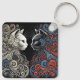 Dos rostros de gato, uno blanco y otro negro, uno frente al otro. Cada gato está adornado con patrones intrincados y giratorios que crean un aspecto dinámico y fluido. El fondo es oscuro, resaltando el contraste entre los gatos claros y los oscuros y los elementos decorativos.
