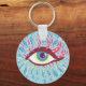 Psicodelic eye keychain con un ilustracion colorido de un extraño ojo azul con grandes pestañas rosadas curvadas, lágrimas azul claro fluyendo por todas partes y muchos elementos rosados y verdes - extensiones de las pestañas.