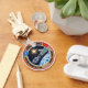 Esta es la insignia de la tripulación norteamericana del Proyecto de Prueba Apolo-Soyuz (ASTP) conjunto Estados Unidos-URSS. De diseño circular, la insignia tiene una colorida zona fronteriza, delineada en rojo, con los nombres de los cinco miembros de la tripulación y las palabras Apolo en inglés y Soyuz en ruso alrededor del concepto de artista de la nave espacial Apolo y Soyuz a punto de atracar en órbita terrestre. El sol brillante y la Tierra azul y blanca están al fondo. Las estrellas blancas en el fondo azul representan a los astronautas estadounidenses Thomas P. Stafford, comandante; Vance D. Brand, piloto del módulo de comando; y Donald (Deke) K. Slayton, piloto del módulo de acoplamiento. Las oscuras estrellas del oro en el fondo rojo representan a los cosmonautas soviéticos Aleksey A. Leonov, comandante, y Valeriy N. Kubasov.