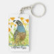 Una cadena de claves decorada con un pájaro codorniz de California con plumas coloridas sobre un parche de flores de amapola naranja brillantes inspiradas en el ave estatal y flor de estado de California dibujada con tinta y pintada con acuarela.