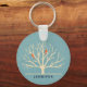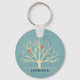 Un llavero con un fondo verde silencioso sobre la parte superior es un árbol amarillo claro con dos siluetas de pájaro naranjas sentadas sobre las ramas.