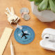 Cadena de teclas de aviación con imagen de avión en un mapa del mundo con fondo azul rústico.