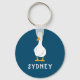 Crea un lindo regalo para los fans de patos con esta cadena de claves personalizada. La cadena de claves redonda azul marino presenta un ilustracion de un pato blanco con la factura naranja y los pies en un estilo simple y realista y su propio nombre o mensaje corto debajo con divertidas letras blancas.