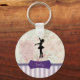 Un tierno keychain con una silueta de una bailarina sobre un fondo de bonito. Esta elegante bailarina de ballet está de pie sobre sus pies, en punta con los brazos extendidos con gracia. El fondo está compuesto por un estampado de aspecto vintage y florido. Una placa decorativa morada contiene el nombre del destinatario. La parte inferior del diseño tiene rayas de lavanda de estilo vintage que se alternan en colores oscuros y claros.