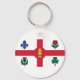 Keychain con la bandera de Montreal, la ciudad más poblada de la provincia de Quebec, Canadá. Bandera blanca con cruz roja, pino blanco, flor azul, rosa roja de Lancaster, roca de champú y cardo