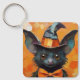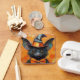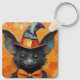 This charming Halloween bat illustration features a patchwork witch hat, orange bow tie, and big expressive eyes against a warm, painterly orange background. A whimsical character perfect for seasonal mail, small art displays, or Halloween fun.