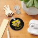 Abeja de miel con alas abiertas icono sobre colmena de abejas y gotas de miel. Color de fondo personalizado. Texto personalizado en ambos lados.