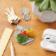 Los pimientos de color verde, amarillo y rojo se sientan en un plato blanco listo para cocinarse. La original es una pintura al óleo en miniatura de Kathie Miller